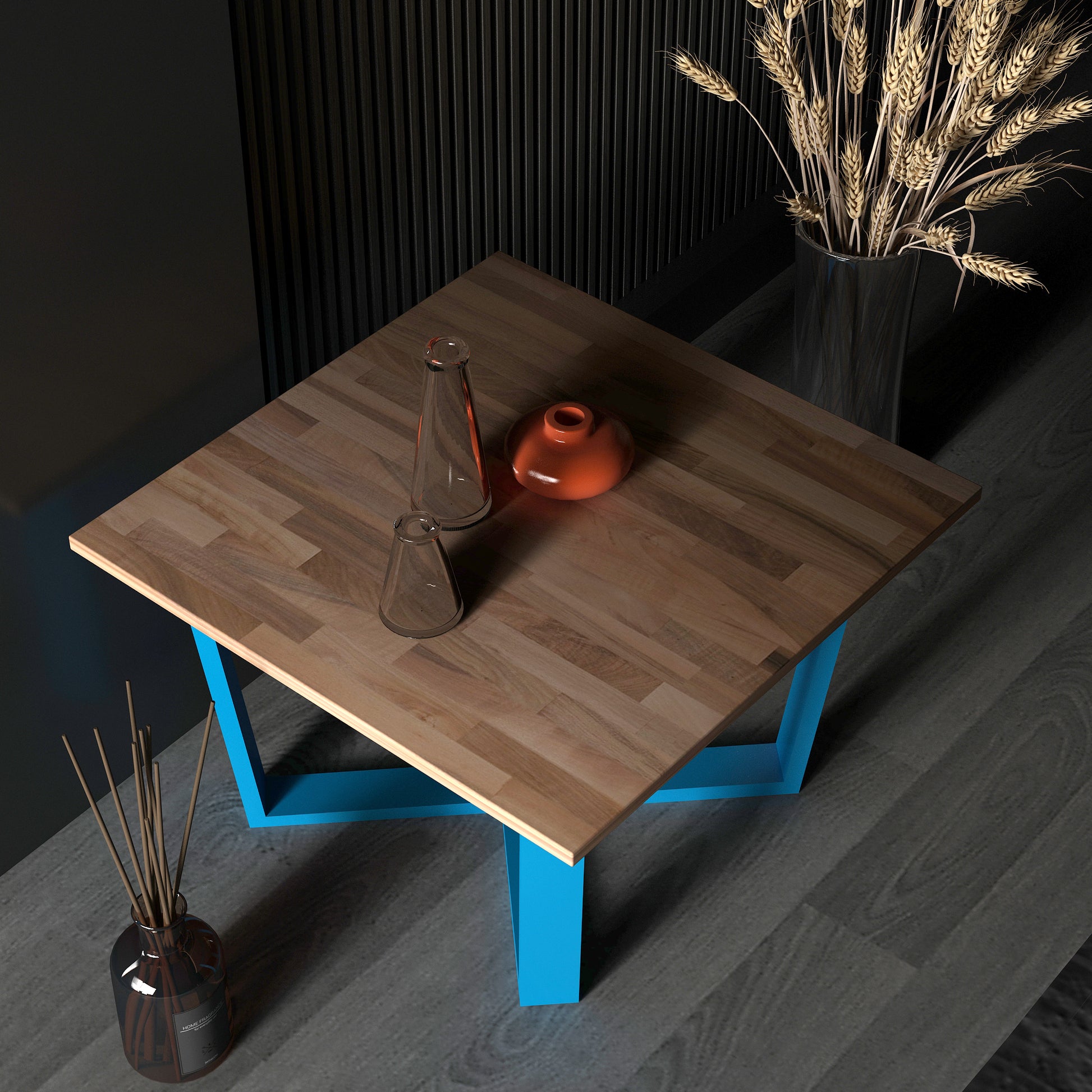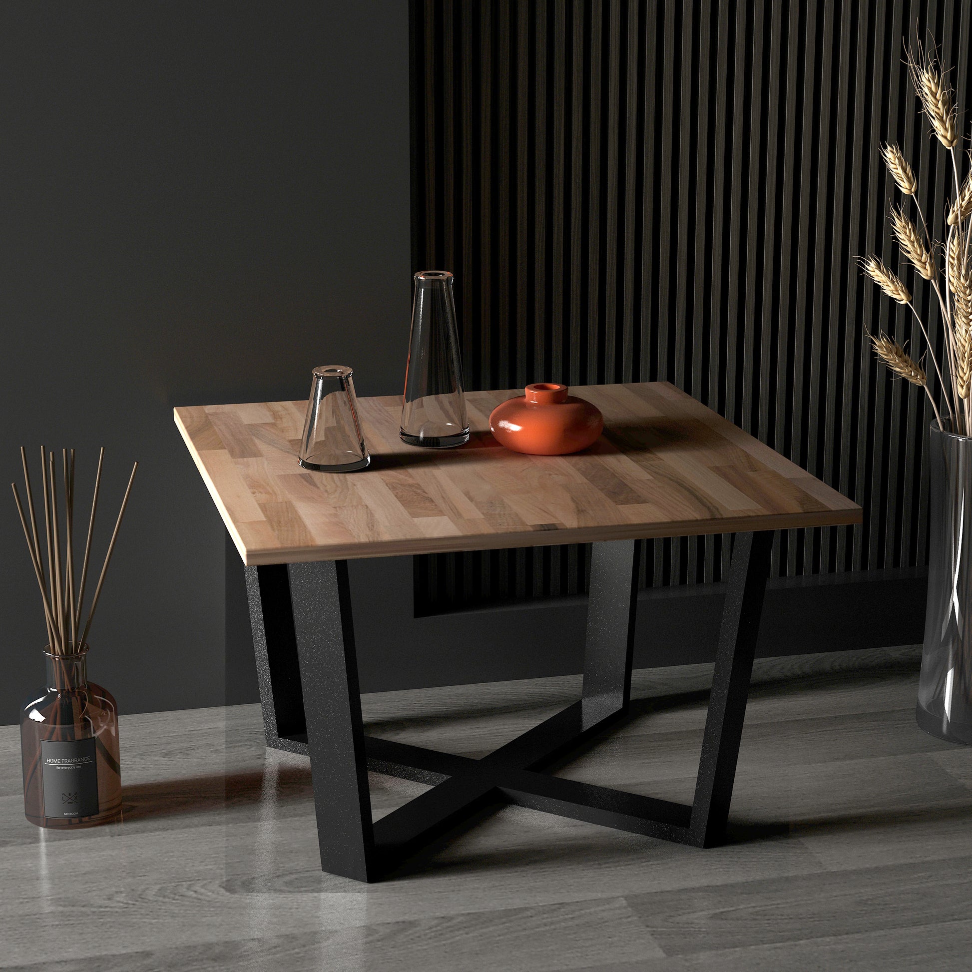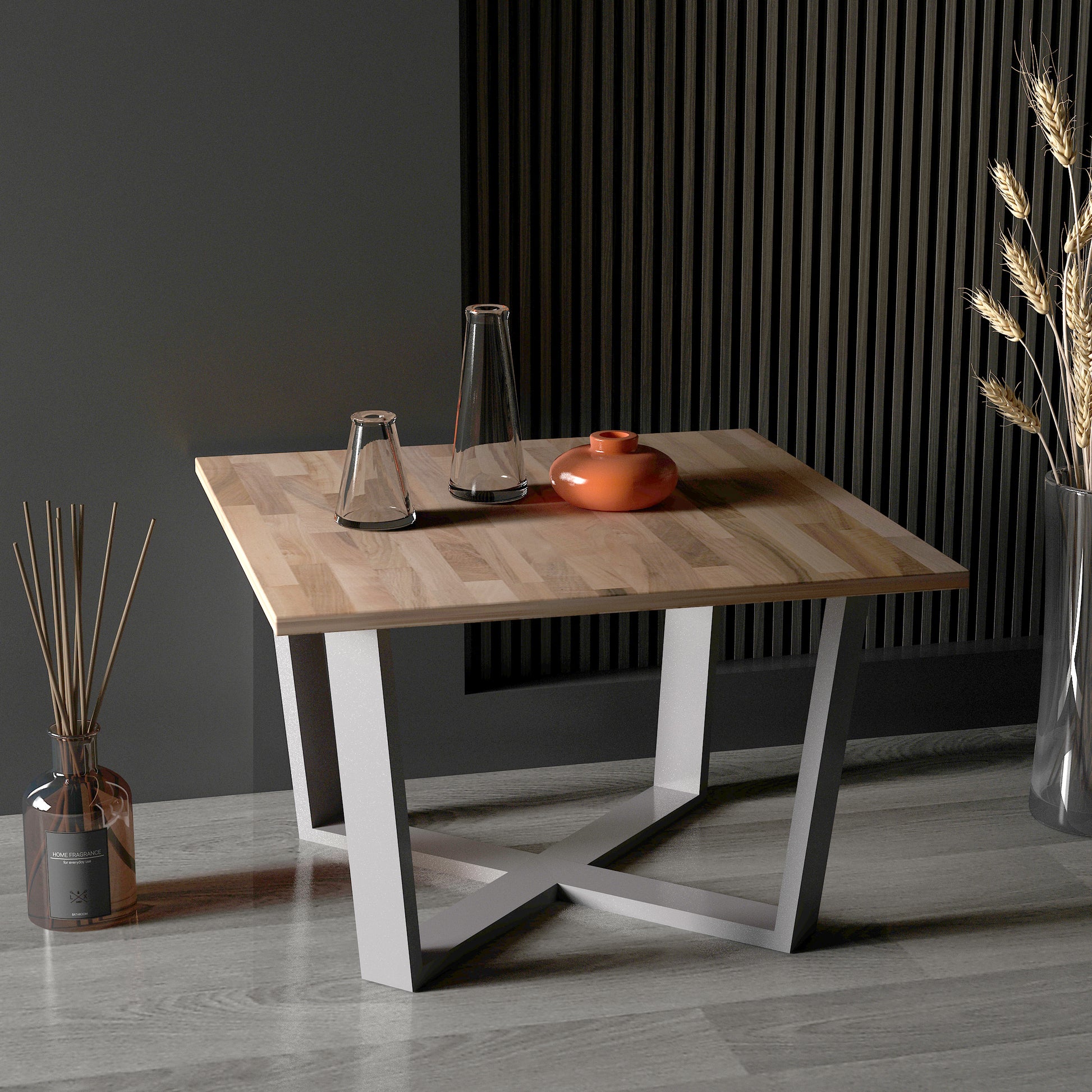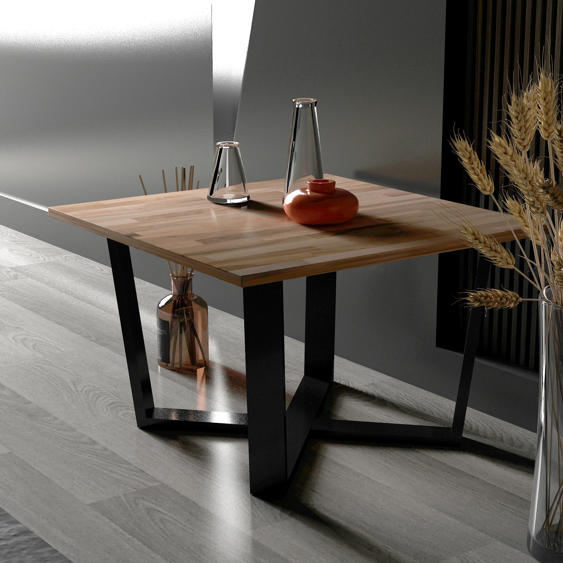 Grahlan kare orta sehpa, metal ayakları ve 2cm kalınlığındaki masif panel tablasıyla dikkat çeken bir mobilya parçasıdır.