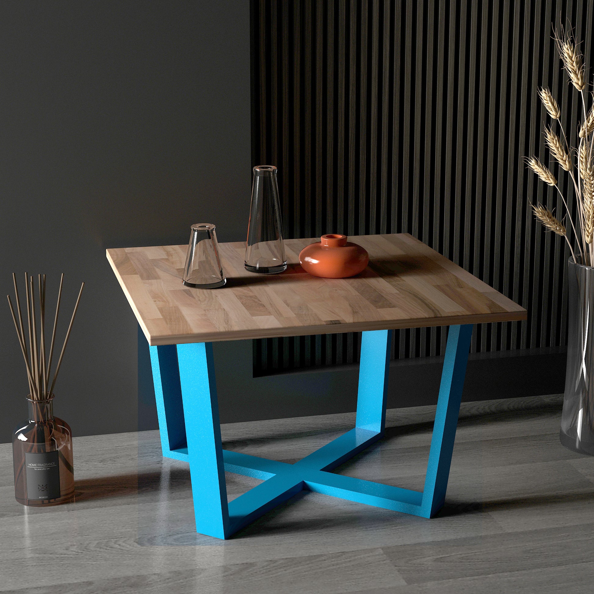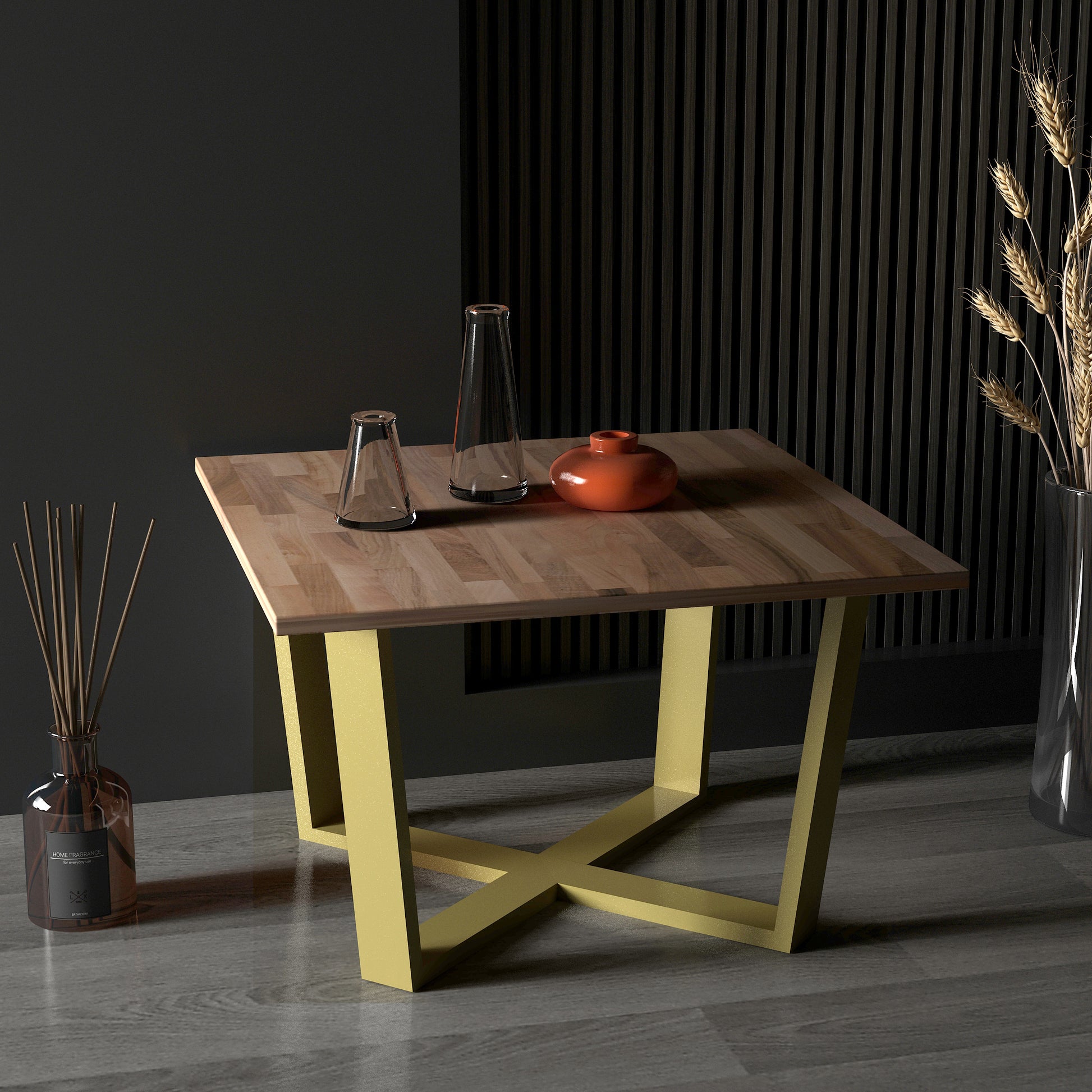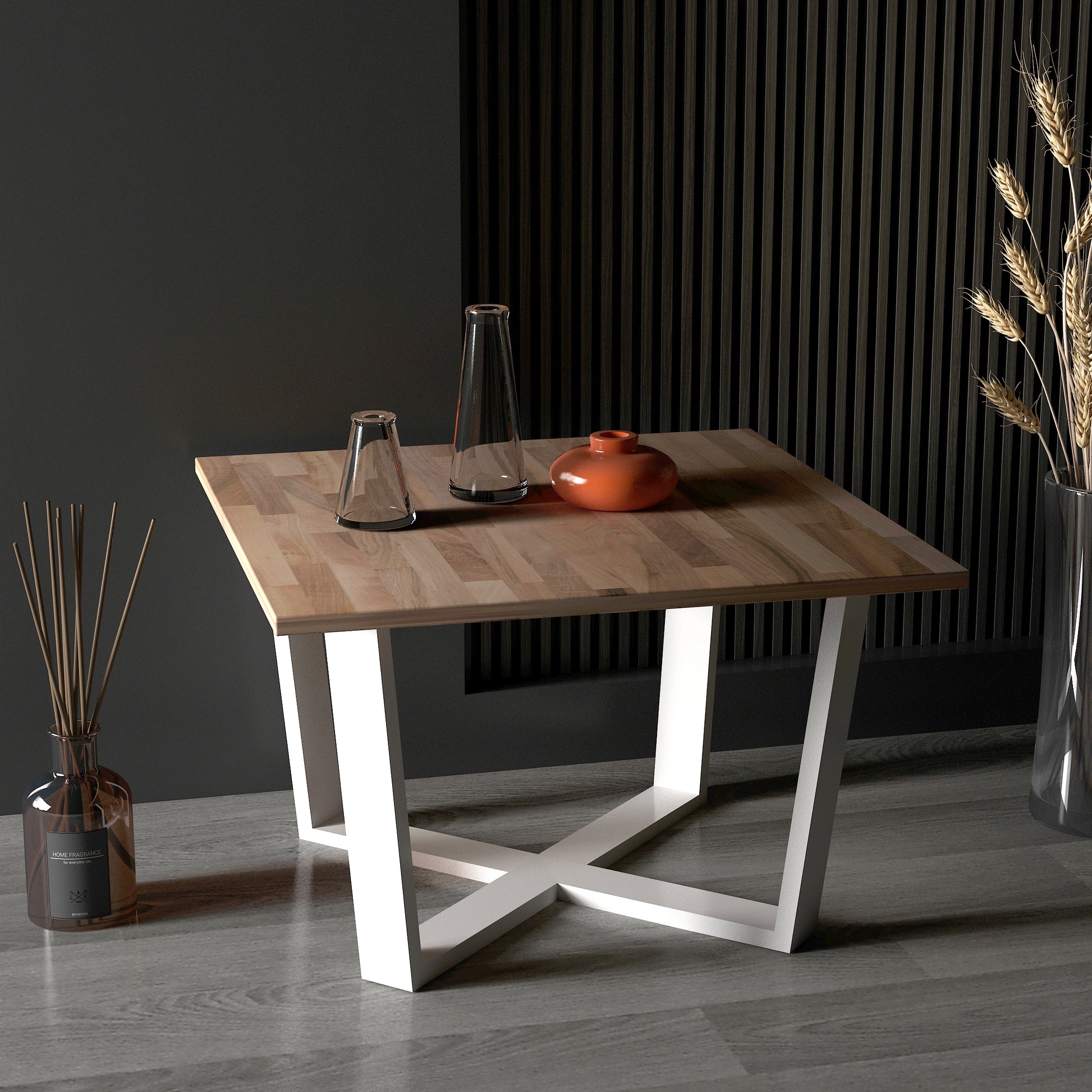 Grahlan kare orta sehpa, metal ayakları ve 2cm kalınlığındaki masif panel tablasıyla dikkat çeken bir mobilya parçasıdır.