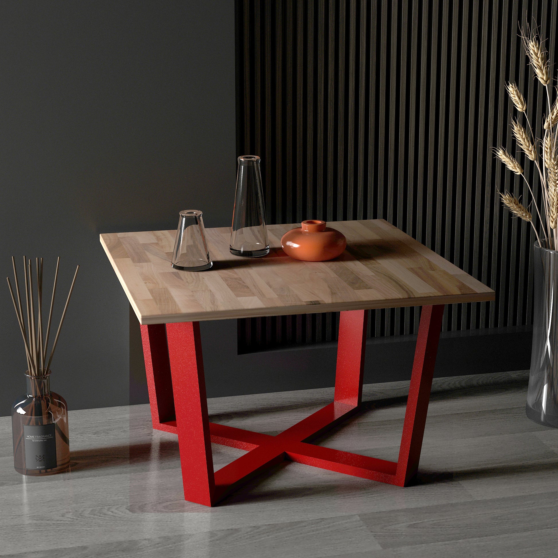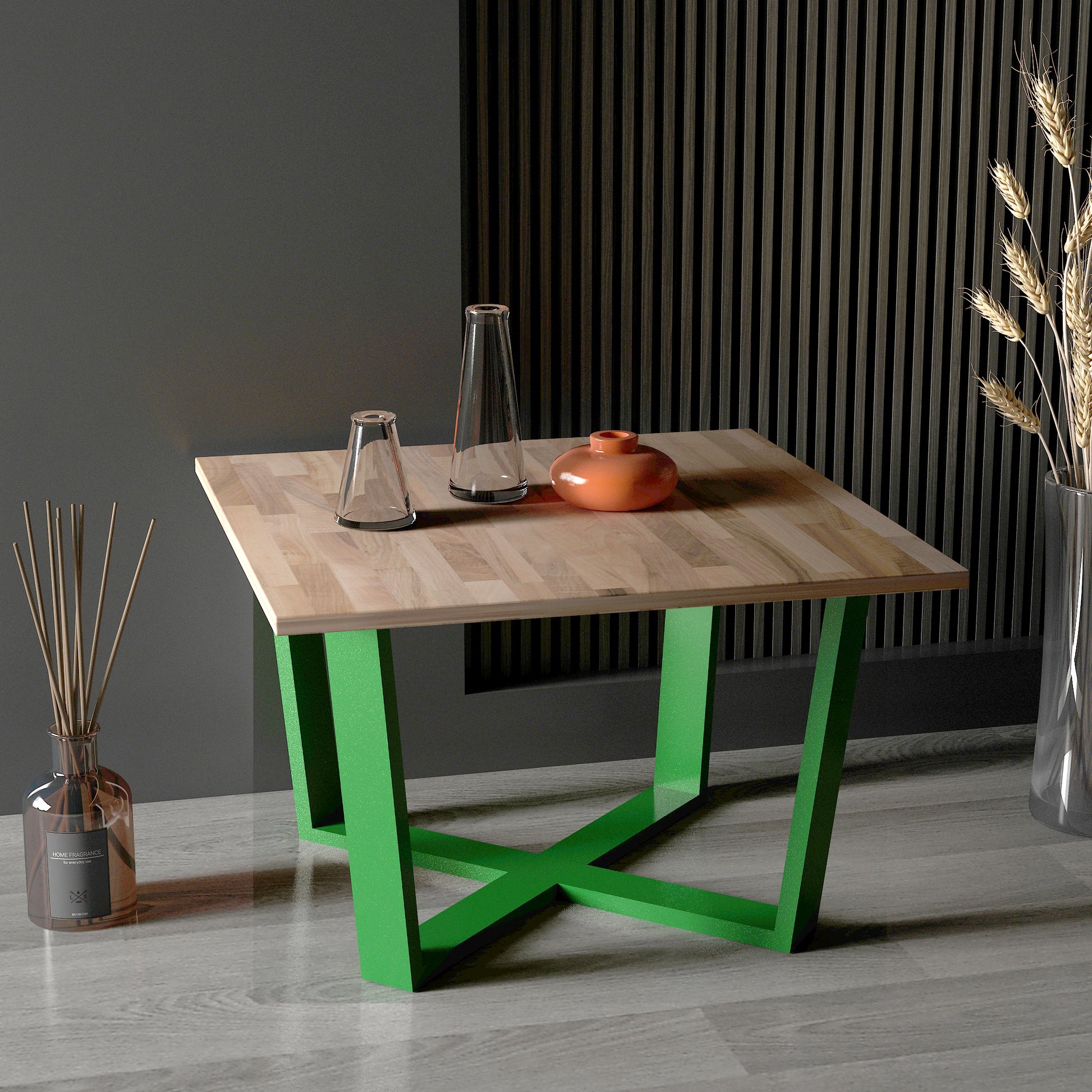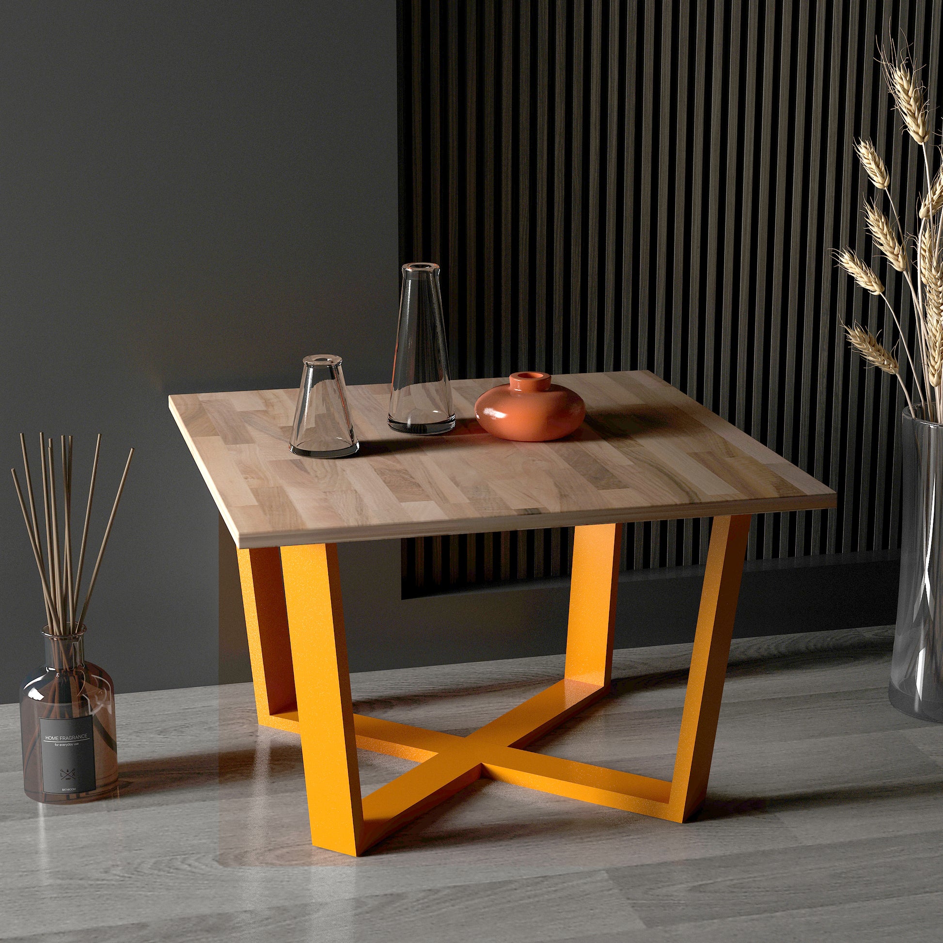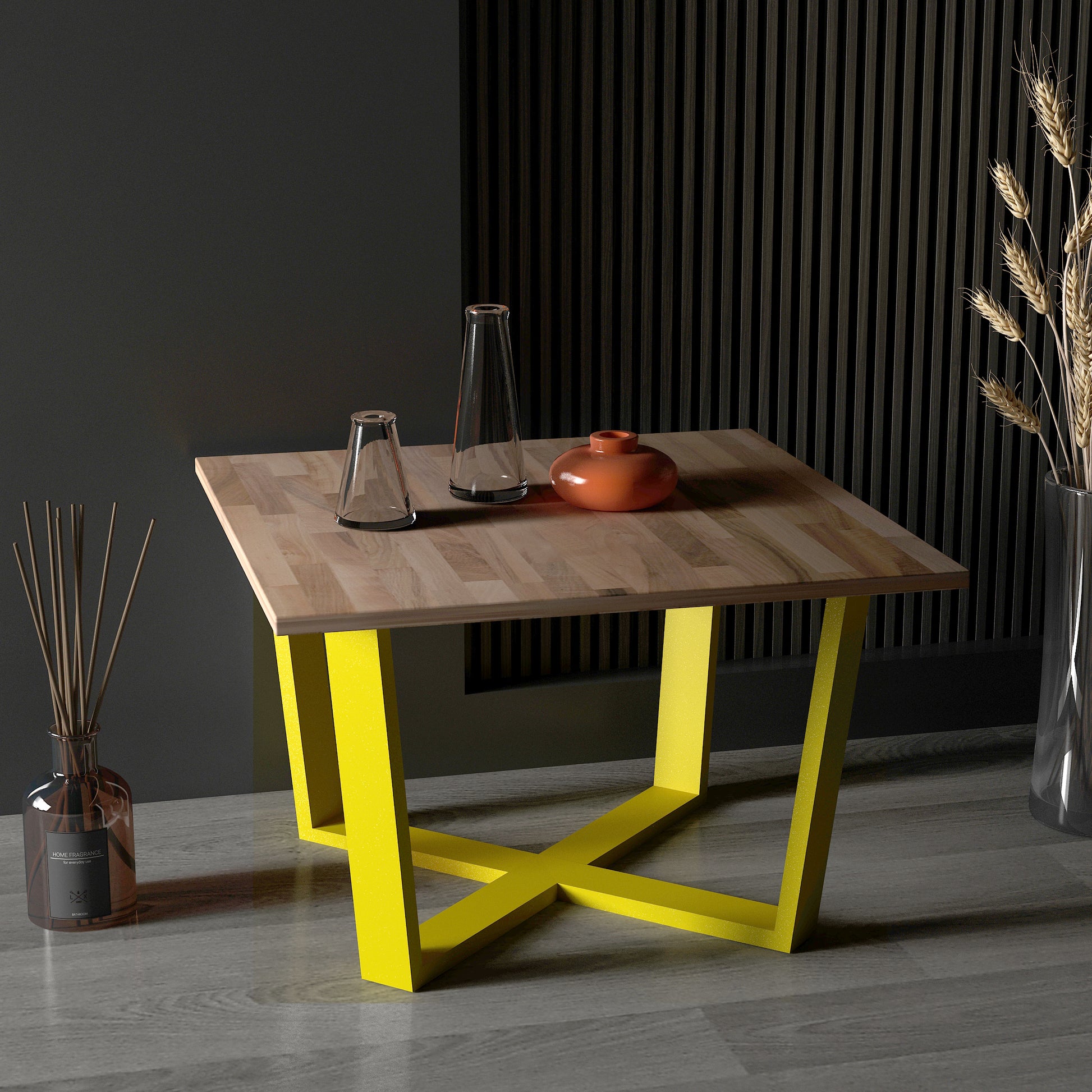 Grahlan kare orta sehpa, metal ayakları ve 2cm kalınlığındaki masif panel tablasıyla dikkat çeken bir mobilya parçasıdır.