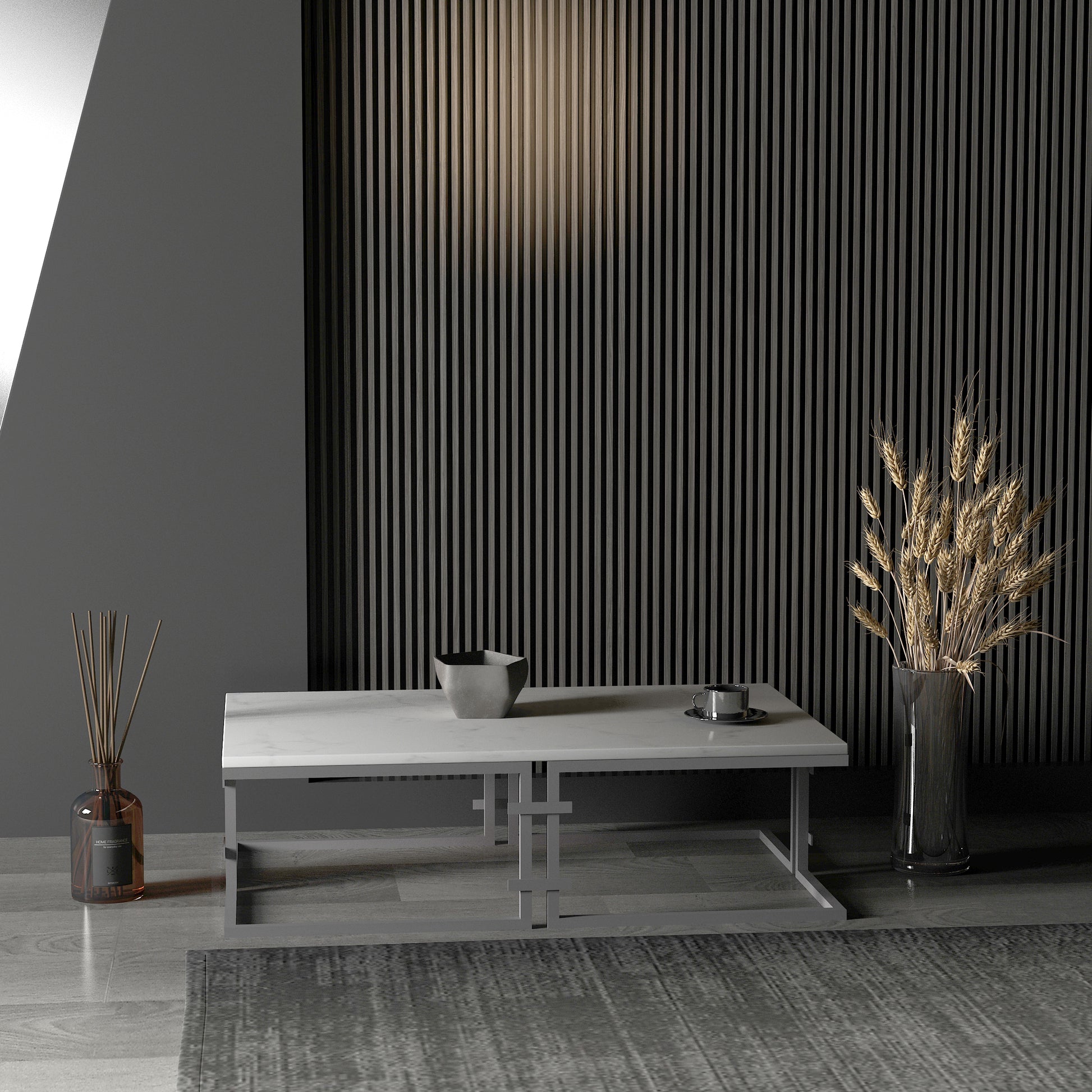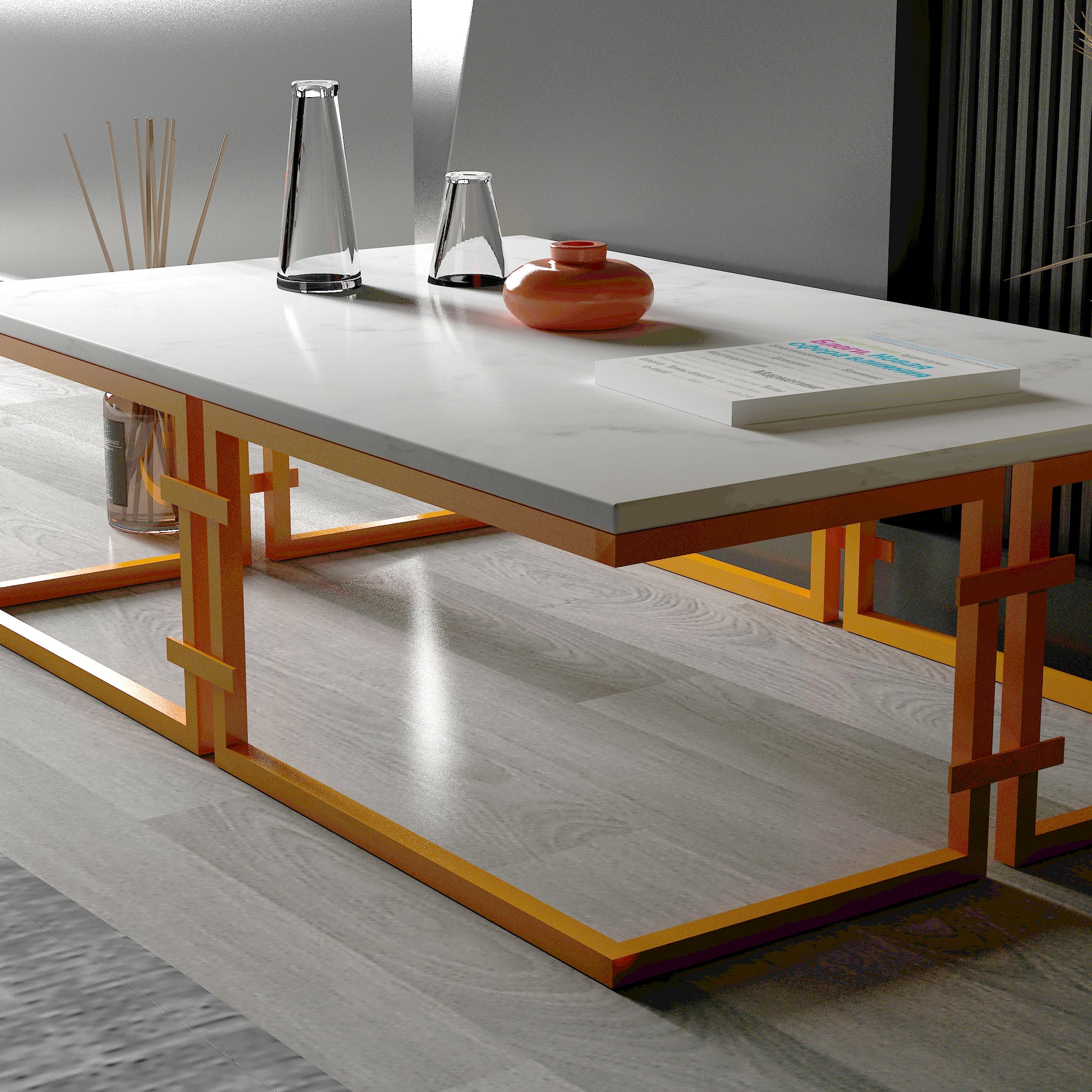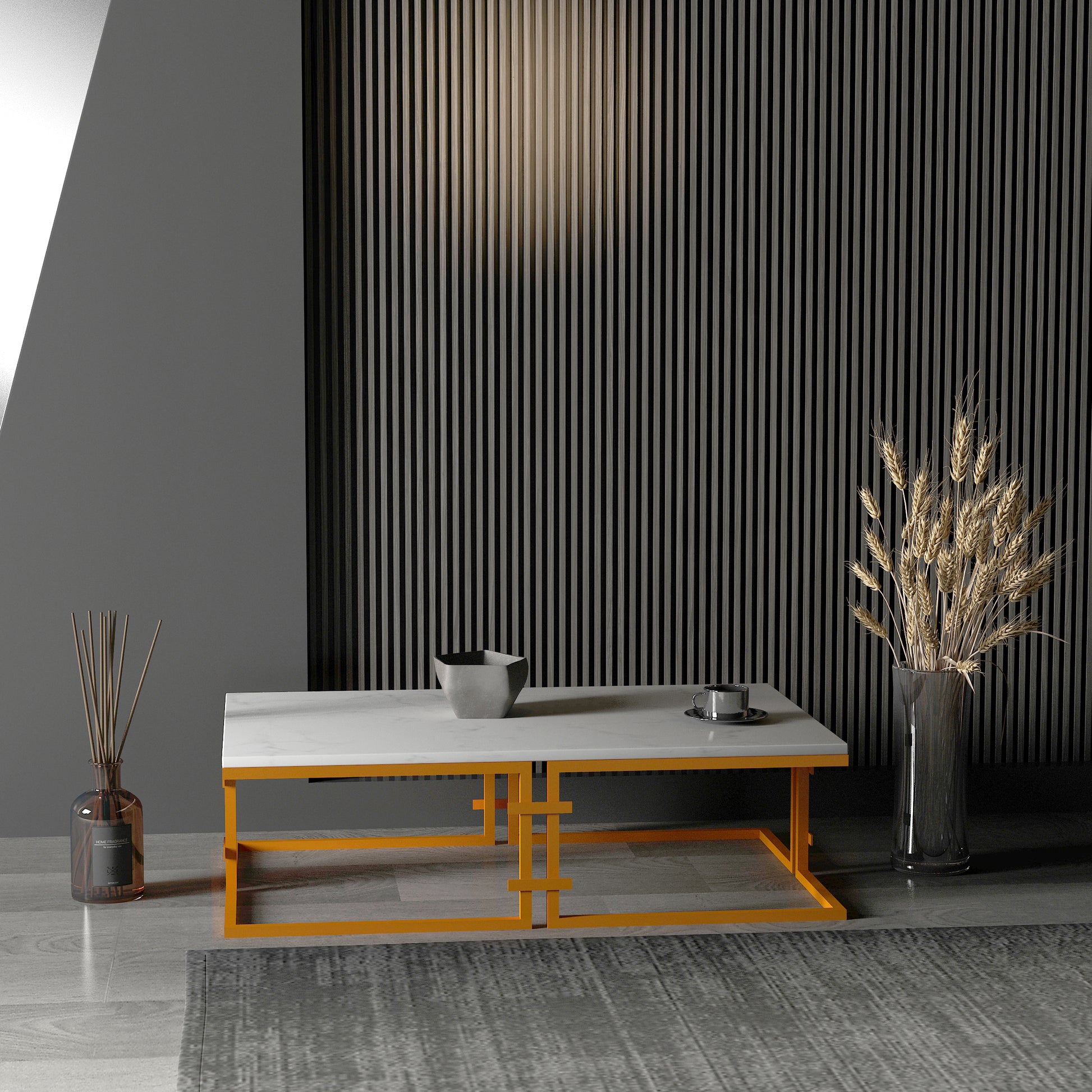 Kemelan dikdörtgen orta sehpa'nın metal ayakları, modern bir estetik sunarken aynı zamanda sağlam bir yapıya sahiptir. 2 cm kalınlığındaki beyaz mermer tablası, zarif bir görünüm sağlar ve dayanıklılığını artırır.