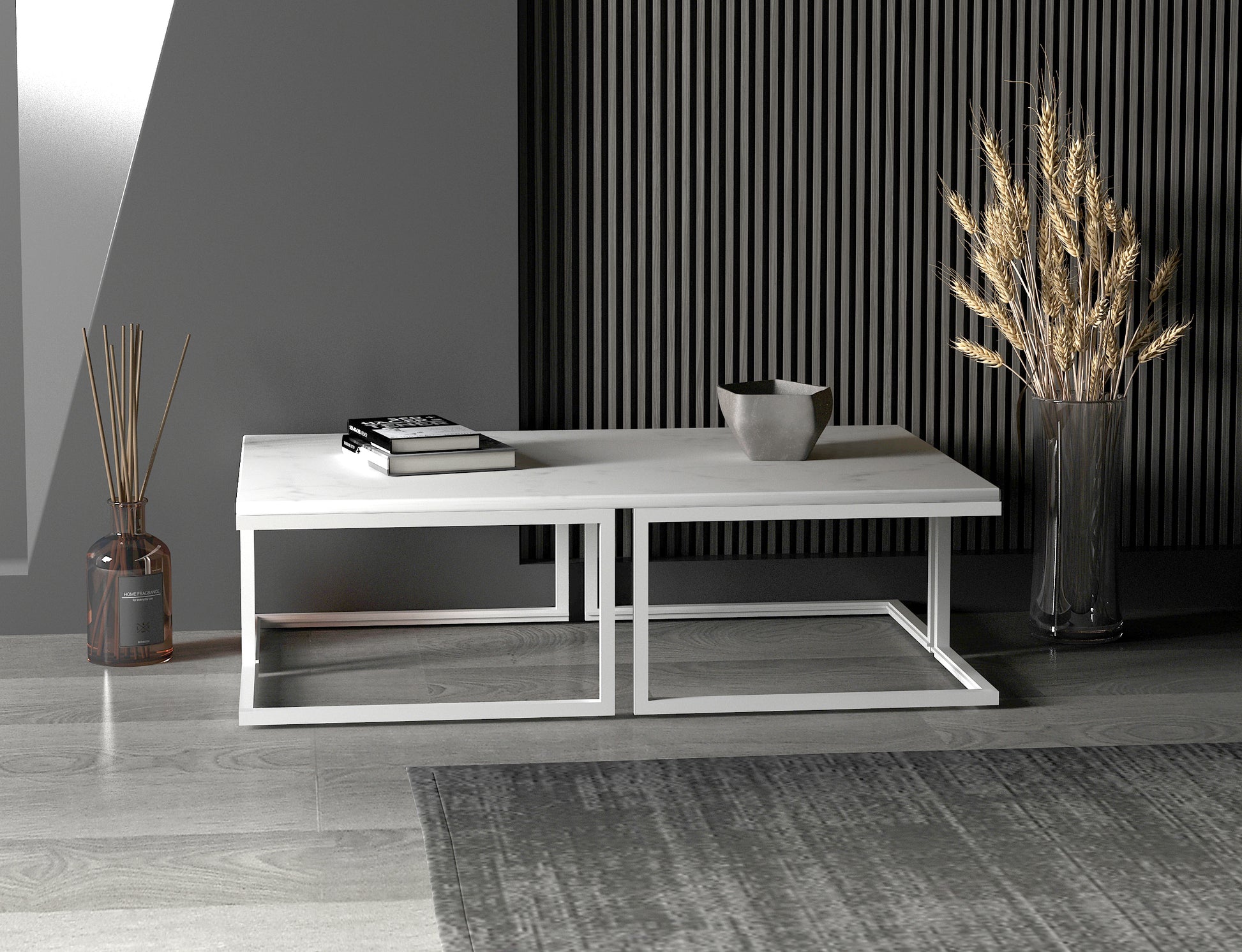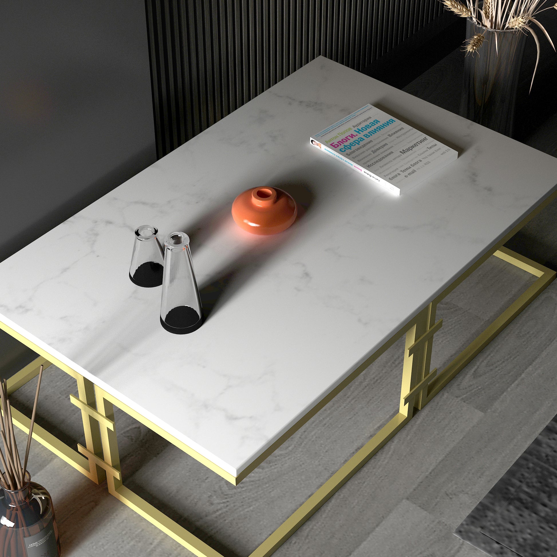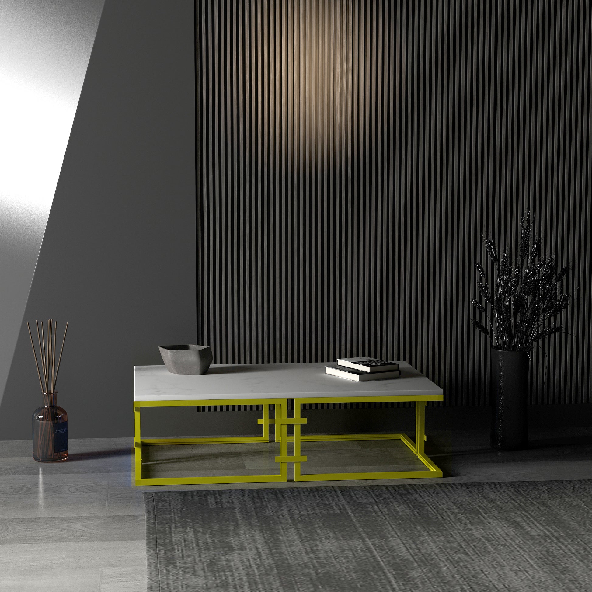 Kemelan dikdörtgen orta sehpa'nın metal ayakları, modern bir estetik sunarken aynı zamanda sağlam bir yapıya sahiptir. 2 cm kalınlığındaki beyaz mermer tablası, zarif bir görünüm sağlar ve dayanıklılığını artırır.